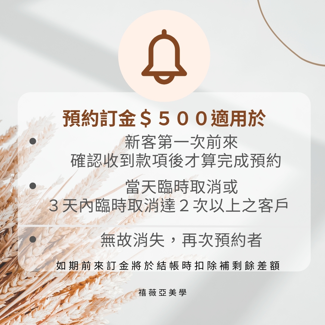 新客預約務必預付預約訂金$500,才算預約完成。此訂金可於結帳時抵扣;3天內取消或當日臨時取消或改約者,訂金不退費